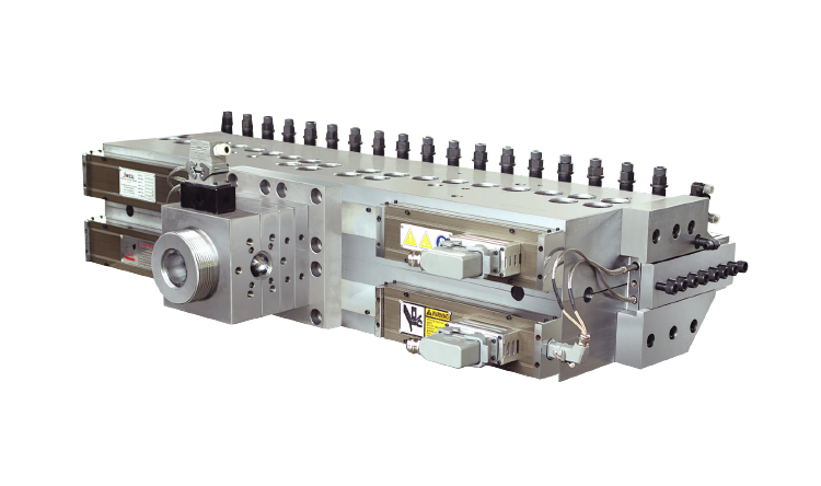 特殊衣架式流道设计,能最大限度上减少热敏性材料在挤出过程中的烧蚀。采用最新研发无节流棒、无活动模唇的设计,模口采用推拉式柔性微调。能满足不同厚度制品要求。分配器采用最新研发PVC专用共挤分配器,适用生产PVC结皮发泡板材,制品厚度5-18mm。