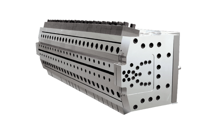 采用双流道设计,上下模唇可调并带有模唇油温控制,所生产制品表面结皮效果好,内应力小,真正实现表面结皮发泡。制品厚度12-35mm.